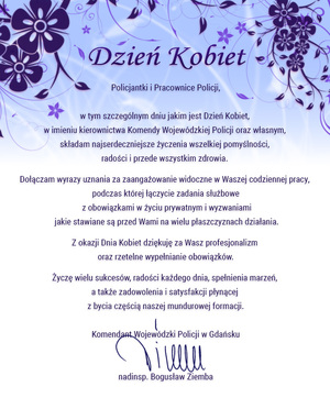 - Życzenia Komendanta Wojewódzkiego Policji w Gdańsku z okazji Dnia Kobiet Dodano: 06.03.2026