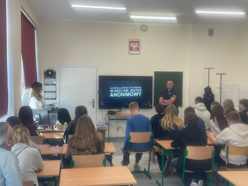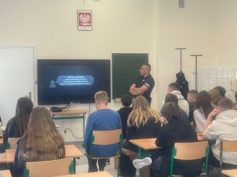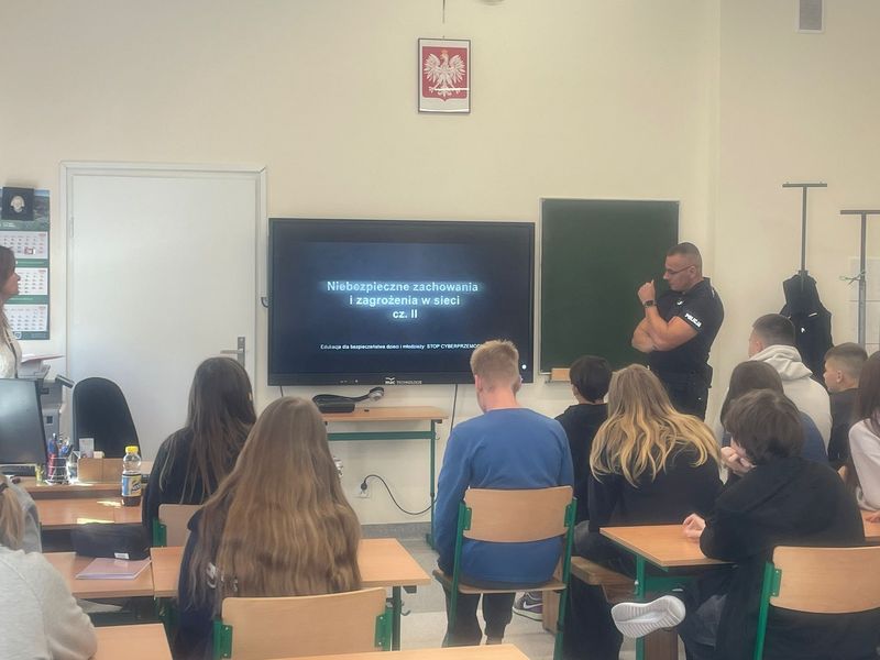 Podczas spotkania uczniowie obejrzeli interesującą prezentację przygotowaną przez prowadzących. Poruszała ona najważniejsze kwestie związane z bezpiecznym korzystaniem z Internetu, odpowiedzialnym używaniem mediów społecznościowych, a także zwracała uwagę na niebezpieczeństwa wynikające z niewłaściwego kontaktu w sieci, m.in. cyberprzemoc, hejt czy zagrożenia ze strony osób nieznajomych. Szczególną uwagę poświęcono również problemowi przemocy rówieśniczej – zarówno fizycznej, jak i psychicznej – wskazując, jak rozpoznać pierwsze symptomy agresji, gdzie szukać pomocy i jak reagować, gdy staje się się świadkiem lub ofiarą takiego zachowania.