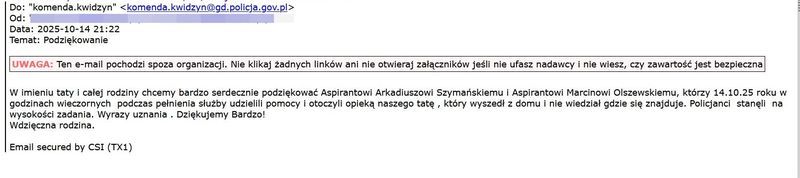 Policjanci przypominają, aby szczególnie w okresie chłodniejszych dni zwracać uwagę na osoby starsze, zagubione lub nieadekwatnie ubrane do pogody. Nie bądźmy obojętni — reagujmy!Wystarczy jeden telefon na numer 112, by zapobiec nieszczęściu i – tak jak w tym przypadku – uratować czyjeś życie.