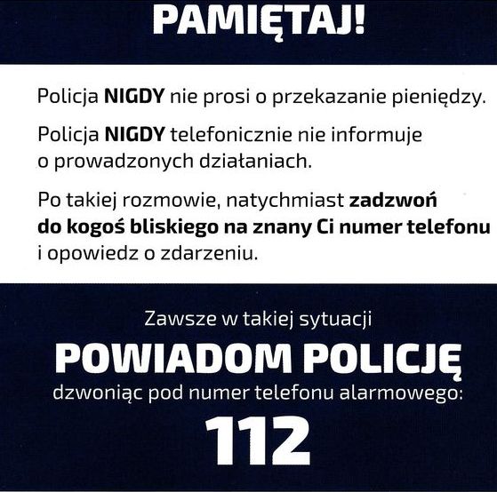 Policja nigdy nie dzwoni z prośbą o przekazanie pieniędzy, zaciągnięcie kredytu ani o udział w „tajnych akcjach”. Mundurowi nigdy nie informują telefonicznie o prowadzonych postępowaniach i nie odbierają gotówki od obywateli.