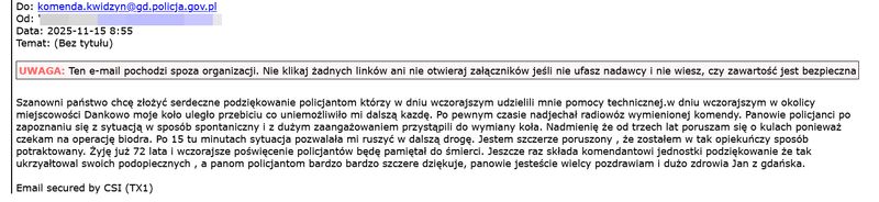 Następnego dnia do komendanta jednostki wpłynął poruszający e-mail od seniora. W swoim liście 72-latek napisał między innymi: